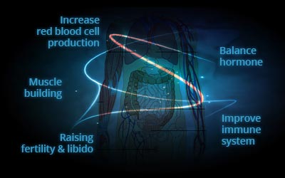 Ia meningkatkan testosteron dengan meningkatkan hormon pelepas gonadotropin (GnRH) yang seterusnya merangsang pengeluaran LH dan hormon perangsang folikel (FSH). Testosteron, selain peranannya dalam membina otot dan meningkatkan kesuburan dan libido, juga diketahui mempunyai kesan positif ke atas aktiviti sumsum tulang (untuk pengeluaran sel darah merah) dan sistem imun.